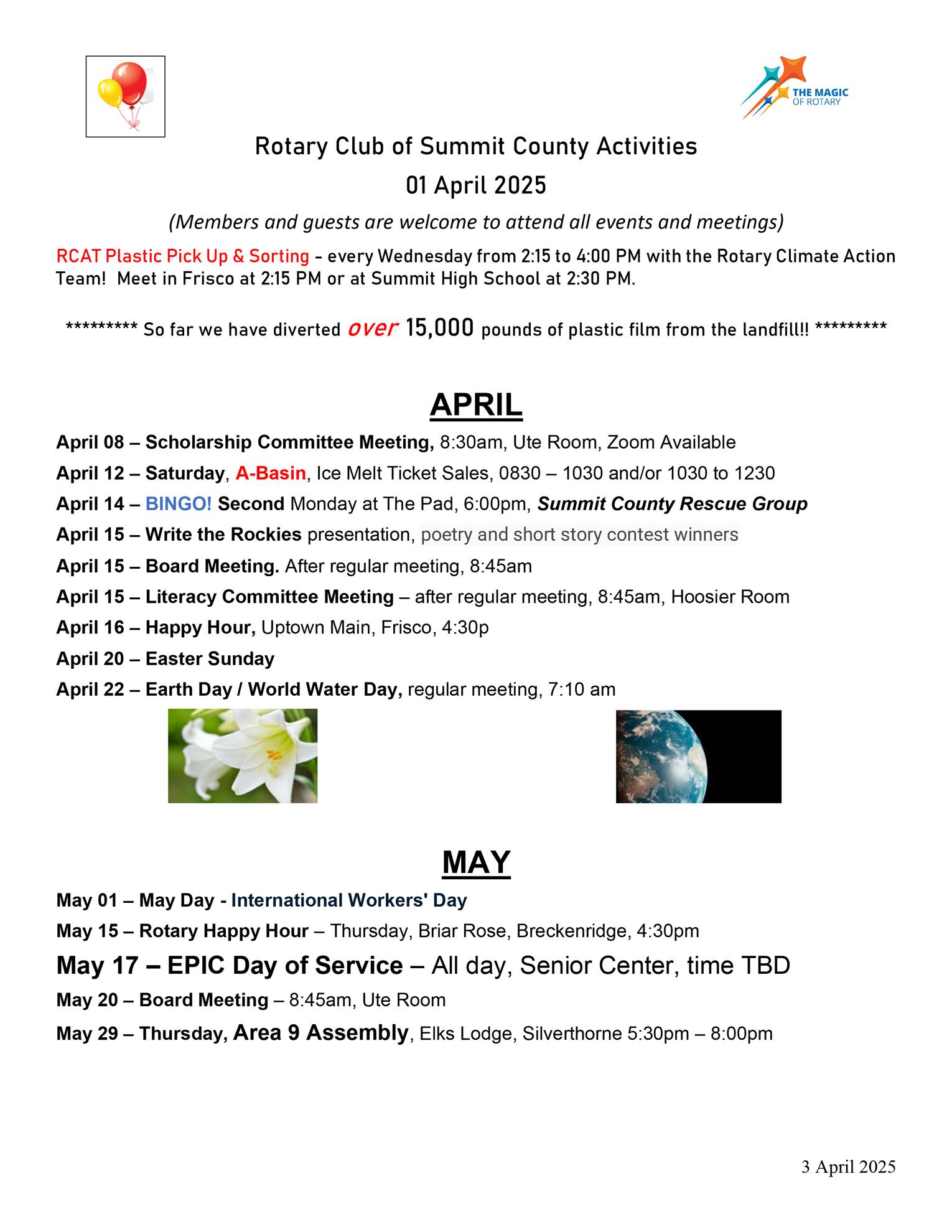 Another Club priority is Fundraising. We have two major fundraising events; Ice Melt and Car Raffle. We are scheduled to sell Ice Melt tickets at A-Basin on Saturday, April 12. This is our LAST CHANCE to sell! Any help with this endeavor is greatly appreciated! Turn your stubs and money in on or before the April 15th meeting. The deadline is actually April 14 when all tickets must be in the hands of a Rotarian.